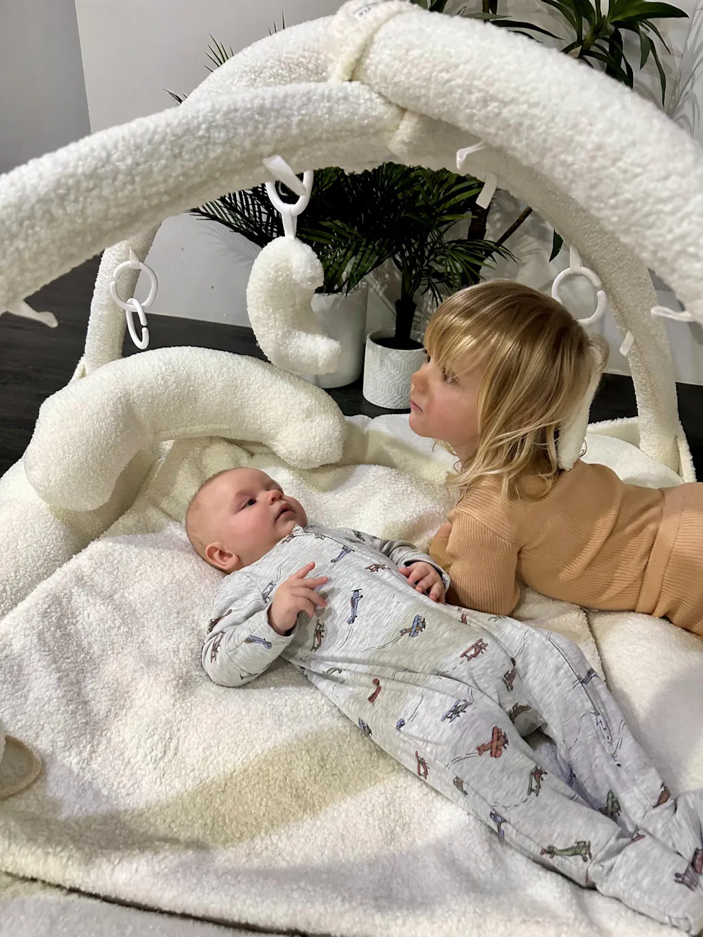 Our cloud activity play mat is made from a white boucle (cloud-like) upper and arches, with a durable 100% cotton tan coloured base. This activity mat is oh-so-soft, with its elegant woolly texture. Boucle balances warmth, cosiness and texture.